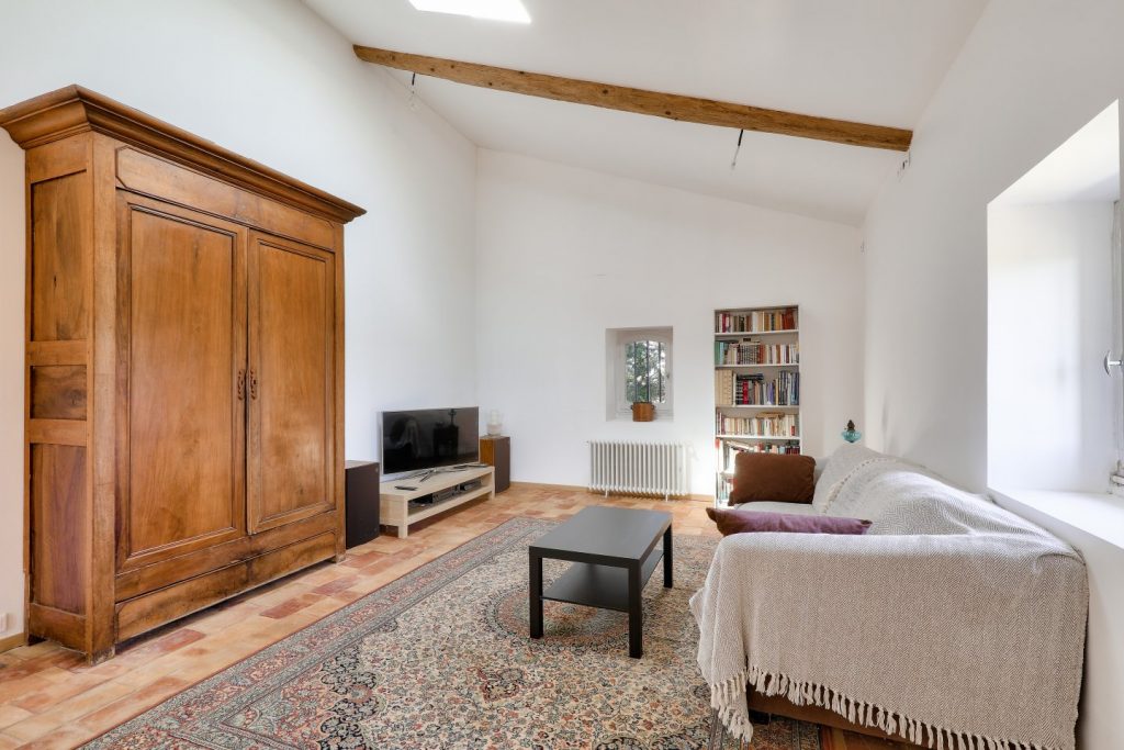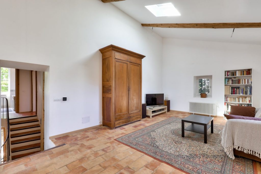 Le salon palier du Mas de la Souvine est un espace chaleureux et accueillant, idéal pour la détente. Aménagé avec des sièges confortables et une décoration élégante, c’est l’endroit parfait pour lire, discuter ou simplement se relaxer après une journée d’exploration en Provence. Profitez de l’atmosphère lumineuse et conviviale de ce coin tranquille, conçu pour votre confort et votre bien-être.