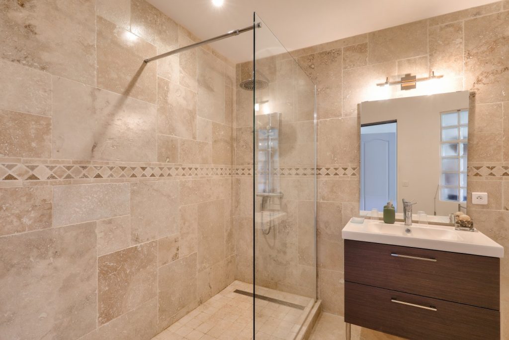 Découvrez une expérience de bain distinctive dans notre salle de bain en travertin, offrant un effet unique et une ambiance raffinée à la Chambre Petite Grange.
