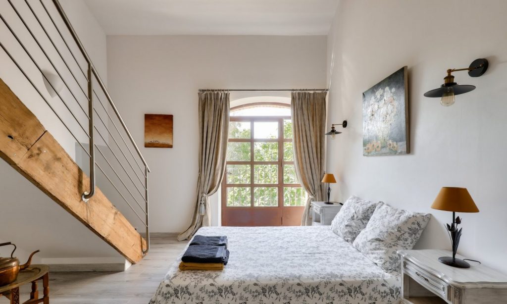 Dans la Chambre Petite Grange, profitez d’un espace généreux avec une hauteur sous plafond de 4,5 mètres, offrant une atmosphère spacieuse et aérée pour votre séjour en Provence.
